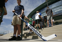 Howie Rylant, 13, packs his hockey stick in hopes of getting it autographed by Trevor