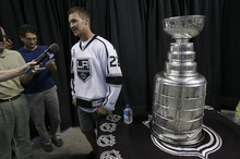 Trevor Lewis, who played hockey for Brighton High School, speaks with the media as he brings the Stanley Cup home for a day as a member of the NHL champion Los Angeles Kings. Thousands of fans lined up at the Maverik Center in West Valley City on Thursday, August 30, 2012, for a chance to pose for a picture with Lewis and the Cup.