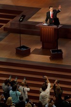 Romney, who has been hesitant to say much about his Mormon faith on the campaign trail, pushed his religion out front and center Thursday, inviting five Mormons on stage to deliver the opening prayer and offer testimonials to his church service and caring nature.