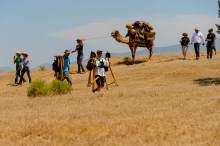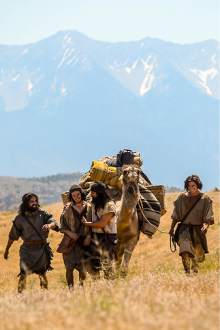 "Camels are not fun to work with at all," a crew member mutters in mock exasperation as the actors portraying Lehi's sons lead Moses back down the hill for another take.