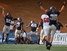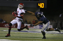 USU's victory wasn't assured until senior cornerback Will Davis broke up a fourth-down pass intended for DeVonte Christopher. Overtime wasn't assured until Utah's Coleman Peterson shanked a potential game-winning 52-yard field goal with two seconds remaining, not once but twice. And victory wasn't possible without Keeton's 23-yard scramble on USU's first overtime possession, culminated with Kerwynn Williams' touchdown run that would prove to be the deciding score.