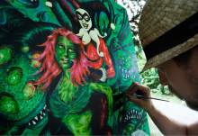 Jordan C. Brun works son a painting from his Garish series, at the Millcreek Arts Festival at