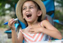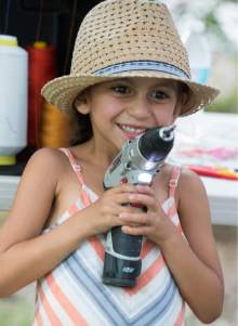 Marla Love, 4, uses a drill to wind some string, as she makes a necklace at the Millcreek Ar