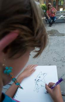 Indy DeBirk, 11, draws a portrait of Zeke the dot, at the Millcreek Arts Festival at the His