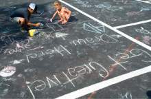 Carter Searcy, 10 makes a chalk drawing with his sister, Elaine Searcy, 5, at the Millcreek A