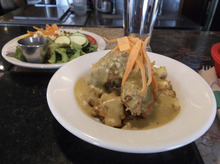 Saffron Valley's rogan josh is a delicious meal at a great price. This Indian wrap, also known as a kati roll, is filled with spicy lamb tikka and sautéed onions, peppers and spinach and then rolled in Indian flatbread. It's served over a bed of refreshing mango vinaigrette salad and accompanied by a cup of soup.