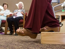 Thompson took them through moves they've taken for granted but need to practice in their aging bodies: how to sit (back up to the chair, feel it with their legs, look behind them and lower down slowly) stand up (scoot to the edge of the chair, lean forward and push up with hands if needed), walk (heel first, wide stance, scan ahead).