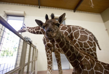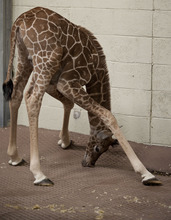 "It's very exciting to have any birth here, but especially giraffes," said animal care supervisor Jane Larson. "They're such large animals. It's so fascinating to see this long-legged creature come out of the giraffe's womb and then they have such a long drop [almost 4 feet]."