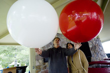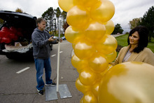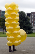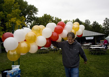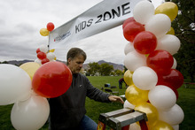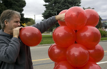 Steve Nielsen, owner of Balloon Bonanza in Sandy, uses air to fill balloons, which are then tied to frames, columns or other types of supports to secure his decorative creations and to achieve ornamental heights.
