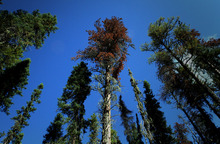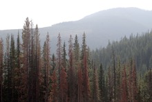 In the Clear Hills, a few hours northwest of Edmonton, they've already run out. The area retains a mix of aspens and spruces, so a forested patchwork remains. But provincial foresters acknowledge they were wrong when they assumed the fading cold would aid them that far north and that the beetle invasion would fizzle. They directed their efforts at removing infested trees to the south, around the mill town of Grande Prairie, and now essentially every mature Clear Hills pine is dead, showing either red needles or bare gray limbs.
