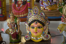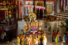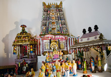The Neelamegghams wanted their shrine to be artistic but whimsical, expressing the notion of a goddess at play. They felt it should be appealing to Hindu children, who learn their faith and life's virtues through storytelling. And, given that Durga means "invincible" in Sanskrit, the display needed to show the goddess' strength and triumph.