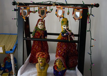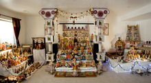 Next the Hindu couple painstakingly peopled the ascending platforms with hundreds of painted clay dolls they have been collecting on trips to India for the past 20 years.