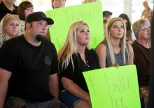 Josh Holt's mother Laurie Holt hugs her uncle Leonard Bell after a rally on the east