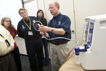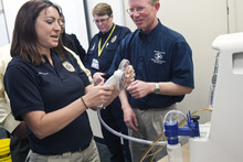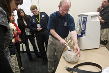 Bradley demonstrated the M-Vac to a room full of officers, medical examiners, attorneys and crime scene technicians at Bardole's police department Wednesday. Draper Police Detective Alyssa McElreath was among those who ran the vacuum on the porous surfaces it's designed to be used on, including a T-shirt, baseball cap and a stone.