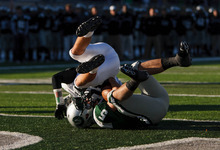 Olympus's Nate Mayer is brought down by Highland's Nolen Groesbeck. Olympus vs. Highland, 4A high school football playoffs Friday October 26, 2012 at Olympus High School in Salt Lake City, Utah.