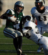 Highland's Jerry Padilla stiff-arms Olympus's Ben Seagle. Olympus vs. Highland, 4A high sch