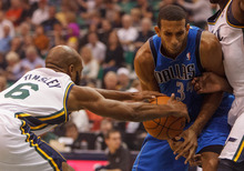 Utah Jazz guard Jamaal Tinsley (6) steals the ball from Dallas's Brandan Wright as the Utah