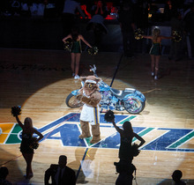 Bear, the mascot of the Utah Jazz, gets the crowd going during the Jazz season opener againt Dallas on Wednesday, Oct. 31, 2012 at EnergySolutions Arena in Salt Lake City.