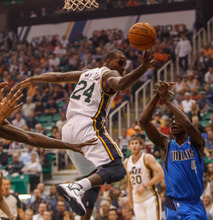 Utah Jazz forward Paul Millsap (24) knocks the ball away from Dallas's Darren Collison during the Jazz season opener Wednesday, Oct. 31, 2012 at EnergySolutions Arena in Salt Lake City.