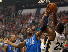 Dallas's O.J. Mayo and Utah center/forward Al Jefferson (25) reach for the rebound during t