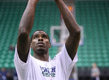 Jazz forward Marvin Williams warms up prior to the tip of the Jazz versus Mavericks game at EnergySolutions Arena in Salt Lake City, Utah Wednesday October 31, 2012.