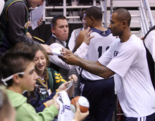 Jazz guard Mo Williams signs autographs after he warmed up prior to the tip of the Jazz ve