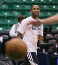 Jazz guard Mo Williams shoots three pointers as he warms up prior to the tip of the Jazz versus Mavericks game at EnergySolutions Arena in Salt Lake City, Utah Wednesday October 31, 2012.