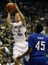 In his first official game back from a two-year break for a mission, Haws picked up where he left off as a freshman, leading all scorers with 22 points on 7-for-15 shooting. The only bummer for Haws was that the streak of 48 consecutive free-throw makes he took with him to the Philippines ended when he missed one in the second half. He swished a pair in the first half for a school-record 50 straight.