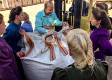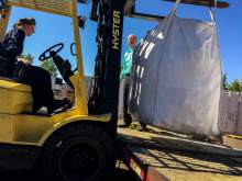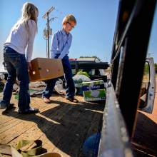 After dropping off the potatoes and wheat in Short Creek, Owen's next stop was at a neighboring community to pick up loaves of bread and bags of bagels and English muffins to take to FLDS members. Ammon and Kathrynn helped Owen load crates of baked goods into the bed of the pickup.