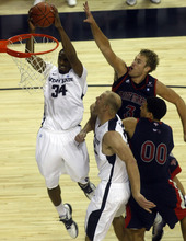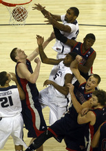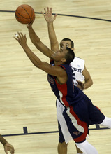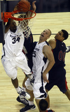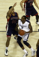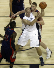But the Gaels found other ways to score, torching the Aggies for nine 3-pointers. At the forefront of the attack was Matthew Dellavedova, the Austrailian senior point guard who lived up to his star billing. He finished with a game-high 21 points, driving inside, dishing out and going perfect from the foul line.