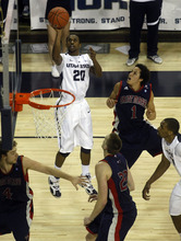 By contrast, Utah State's backcourt struggled. Junior Preston Medlin had a cold night, scoring seven points on 3-for-11 shooting as Dellavedova and other lengthy Gaels barely gave him room to breath. Starting point guard TeNale Roland was uncomfortable as well, going 1 for 9 from the field before sitting out most of the second half as Medlin played point.