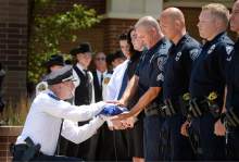 Sgt. Chad Reyes accepts the flag that draped his K-9 partner's casket on Saturday from Sheriff Jim Winder at the memorial service for "Dingo," a Unified Police Department dog shot and killed in the line of duty July 6.