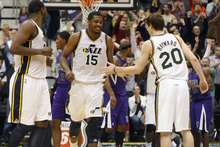 Utah Jazz center Al Jefferson (25) Utah Jazz power forward Derrick Favors (15) and Utah Ja