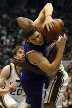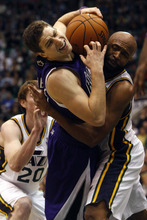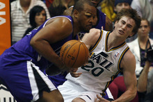 Utah Jazz shooting guard Gordon Hayward (20) guards Sacramento Kings power forward Chuck Hayes (42) during the fourth quarter of the game at EnergySolutions Arena Friday November 23, 2012. The Jazz won the game 104-102.