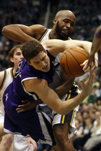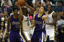Sacramento Kings point guard Jimmer Fredette (7) and Utah Jazz point guard Jamaal Tinsley (6) go for the ball during the fourth quarter of the game at EnergySolutions Arena Friday November 23, 2012. The Jazz won the game 104-102.