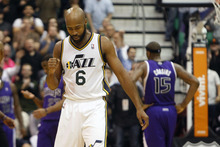 Utah Jazz point guard Jamaal Tinsley (6) celebrates after scoring a point during the fourt