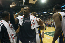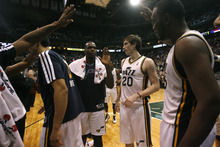 Utah Jazz power forward Paul Millsap (24) Utah Jazz shooting guard Gordon Hayward (20) and Utah Jazz center Al Jefferson (25) celebrate after winning the game at EnergySolutions Arena Friday November 23, 2012. The Jazz won the game 104-102.