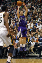 Sacramento Kings point guard Jimmer Fredette (7) shoots the ball during the fourth quarter of the game at EnergySolutions Arena Friday November 23, 2012. The Jazz won the game 104-102.
