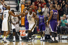 Utah Jazz center Al Jefferson (25) celebrates after hitting two free throws during the fourth quarter of the game at EnergySolutions Arena Friday November 23, 2012. The Jazz won the game 104-102.