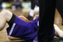 Sacramento Kings point guard Jimmer Fredette (7) remains on the ground during the fourth quarter of the game at EnergySolutions Arena Friday November 23, 2012. The Jazz won the game 104-102.