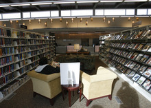 The administrative offices and the one-story library are connected by a hallway and have shared meeting space between them. Wood and stone on both the interior and exterior of the offices and library help tie them together.