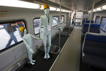 Mannequins advise holding your child's hand while entering and exiting as media are invited to ride the new FrontRunner line from Salt Lake City to Provo on Friday, November 30, 2012, as UTA gets ready to open for regular service on Monday, December 10, 2012. The public is also welcome to try out the line as part of their "Food for your fare" on Saturday, December 8, 2012, from 10 a.m to 10 p.m by providing a non-perishable food item to be donated as "fare" to benefit the Utah Food Bank and the Community Action Services.