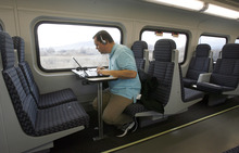 Randall Jeppesen with KSL Radio takes advantage of power outlets and free onboard wi-fi as he works on the FrontRunner train during a media invitation to ride the new FrontRunner line from Salt Lake City to Provo on Friday, November 30, 2012, as UTA gets ready to open for regular service on Monday, December 10, 2012. The public is also welcome to try out the line as part of their "Food for your fare" on Saturday, December 8, 2012, from 10 a.m to 10 p.m by providing a non-perishable food item to be donated as "fare" to benefit the Utah Food Bank and the Community Action Services.