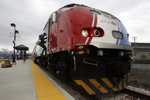 Train operator Ananda Alles climbs aboard the FrontRunner engine as he gets ready to transport the media from the new Provo station back to Salt Lake City on Friday, November 30, 2012, as UTA gets ready to open for regular service on Monday, December 10, 2012. The public is also welcome to try out the line as part of their "Food for your fare" on Saturday, December 8, 2012, from 10 a.m to 10 p.m by providing a non-perishable food item to be donated as "fare" to benefit the Utah Food Bank and the Community Action Services.