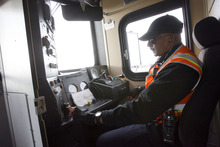 Train operator Ananda Alles heads South operating the train from the tail end of the new FrontRunner line from Salt Lake City to Provo on Friday, November 30, 2012, as UTA gets ready to open for regular service on Monday, December 10, 2012. The public is also welcome to try out the line as part of their "Food for your fare" on Saturday, December 8, 2012, from 10 a.m to 10 p.m by providing a non-perishable food item to be donated as "fare" to benefit the Utah Food Bank and the Community Action Services.