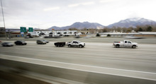 The train on the new FrontRunner line passes vehicles traveling at highway speeds near Draper while traveling from Salt Lake City to Provo on Friday, November 30, 2012, as UTA gets ready to open for regular service on Monday, December 10, 2012. The public is also welcome to try out the line as part of their "Food for your fare" on Saturday, December 8, 2012, from 10 a.m to 10 p.m by providing a non-perishable food item to be donated as "fare" to benefit the Utah Food Bank and the Community Action Services.