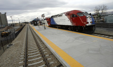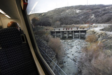 The new FrontRunner train line from Salt Lake City to Provo affords new views including the South Jordan Narrows where 2 canals were relocated and difficult engineering practices were put to use as seen during a tour on Friday, November 30, 2012, as UTA gets ready to open for regular service on Monday, December 10, 2012. The public is also welcome to try out the line as part of their "Food for your fare" on Saturday, December 8, 2012, from 10 a.m to 10 p.m by providing a non-perishable food item to be donated as "fare" to benefit the Utah Food Bank and the Community Action Services.