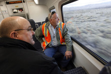 Fred Engum, left, a contractor for UTA, and Joel Gray, a maintenance supervisor for UTA, look out into South Jordan as they ride the new FrontRunner line from Salt Lake City to Provo on Friday, November 30, 2012, as UTA gets ready to open for regular service on Monday, December 10, 2012. The public is also welcome to try out the line as part of their "Food for your fare" on Saturday, December 8, 2012, from 10 a.m to 10 p.m by providing a non-perishable food item to be donated as "fare" to benefit the Utah Food Bank and the Community Action Services.