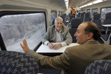 UTA board member and vice chairman H. David Burton, left, and UTA General Manager Michael Allegra admire the work done as they ride the new FrontRunner line from Salt Lake City to Provo on Friday as UTA gets ready to open for regular service on Monday. The public is also welcome to try out the line as part of their "Food for your fare" on Saturday from 10 a.m to 10 p.m by providing a non-perishable food item to be donated as "fare" to benefit the Utah Food Bank and the Community Action Services.