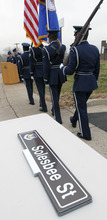 Rain drizzled as Lilia Solesbee pulled the strings to remove a paper cover from the street sign bearing her husband's name.